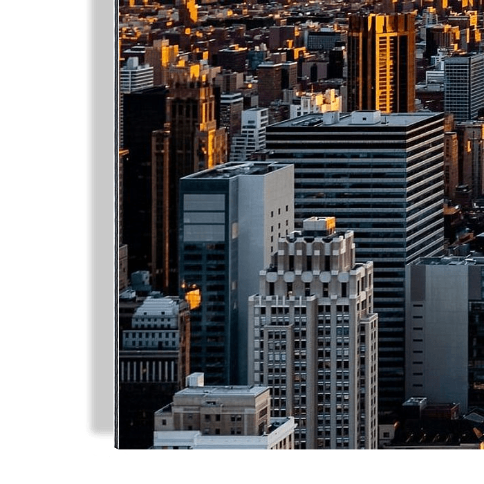 Het uitzicht over lower Manhattan, Empire State Building en OneWorld Trade Center vanaf Top of the Rock (Rockfeller Center) bij zonsondergang.
