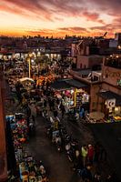Zonsondergang over de stad Marrakesh in Marokko. Djemaa el Fna. Roze en gele wolken.