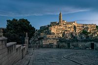 Deze fascinerende foto toont de iconische Sassi di Matera bij zonsondergang, badend in het laatste gouden licht van de dag. De top van de oude stad wordt verlicht door de warme gloed en vormt een opvallend contrast met de koele, diepblauwe lucht erboven. Matera, met zijn unieke stenen woningen uitgehouwen in de kliffen, lijkt bijna tijdloos op dit moment, met het zachte licht dat de texturen en details van de oude architectuur benadrukt. De schaduwen sluipen langzaam over het lagere deel van de stad en voegen diepte en drama toe aan de scène.