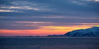 Besneeuwde winterlandschap zonsondergang aan de oever van de Vestfjord vanaf een van de eilanden van de Vesteralen archipel in de buurt van Lodingen in Noorwegen De bergen zijn bedekt met sneeuw en er drijven wolken over de bergen in de verte.