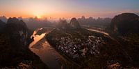 Een schitterende warme zonsondergang over het historische vissersdorp Xingping aan de Li rivier, bekend van de traditionele vissers die met aalscholvers vissen en de hier goed zichtbare kalksteen bergformaties.