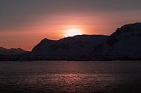 Zonsondergang over de besneeuwde Noorse bergen na een mooie winterdag.