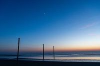 Op een mooie lenteavond op het strand aan de Noordzeekust ging de zon langzaam onder, de maan verscheen als een kleine sikkel, de lucht toonde zijn mooiste blauw en aan de horizon zag je nog een strook oranje licht weerspiegeld in het ondiepe water.