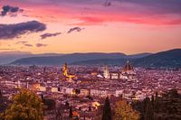 Florence straalt onder een levendige zonsondergang in roze, oranje en paarse tinten.