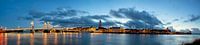 Zonsondergang over de skyline van Kampen aan de IJssel. Weidse panoramafoto tijdens zonsondergang over de Hanzestad aan de oever van de IJssel.