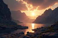 Een serene zonsondergang verlicht een berglandschap. Een kalm meer weerspiegelt de warme, oranje tinten van de lucht tussen donkere, rotsachtige bergen. De scène is digitaal gerenderd.