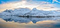Zonsondergang over een kalm Husvågen meer in de Lofoten archipel in Noorwegen in de winter. De bergen zijn bedekt met sneeuw en drijft wat ijs dat op het water. De bergen en de lucht worden weerspiegeld in het meer. Breed panorama beeld.