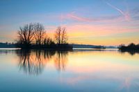 Zonsondergang over een meer met eilandjes aan het eind van een winterse dag bij het Vossenmeer in de IJsseldelta regio in Overijssel, Nederland.