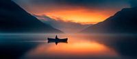 Een zachte zonsopgang baadt het landschap in warm licht, terwijl een eenzame kano majestueus over het spiegelgladde water glijdt. Mist omhult glooiende heuvels en verleent het beeld een mystieke sfeer. Dit kunstwerk zou een perfecte toevoeging zijn aan een woonkamer die rust en inspiratie uitstraalt.