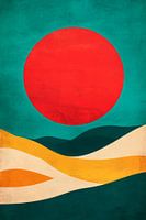 Een felrode zon schijnt in een harmonieus kleurenspel en blijft betoverd aan de hemel hangen. Zachte, zandkleurige golven stromen zachtjes over het groenblauwe oppervlak en doen denken aan een verstild landschap. Deze minimalistische compositie fascineert door zijn contrast en eenvoud en nodigt uit tot nadenken.