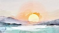 Deze schilderachtige illustratie vangt de vredige schoonheid van een grote zonsondergang boven een rustig meer omringd door indrukwekkende bergen. De lucht is gekleurd in warme tinten van diep oranje, zacht geel en zacht roze, wat de afbeelding een uitnodigende en rustgevende sfeer geeft. De zon, die op het punt staat onder te gaan, wordt weerspiegeld op het stille wateroppervlak en creëert een gevoel van harmonie en sereniteit. De majestueuze bergen die het meer omlijsten zijn afgebeeld in zachte silhouetten, wat diepte en perspectief toevoegt aan het beeld. Dit tafereel nodigt de kijker uit om te genieten van een moment van stilte en rust, ver weg van de drukte van alledag. Perfect als muurkunst voor woonruimtes die een rustgevende en natuurminnende sfeer willen creëren.