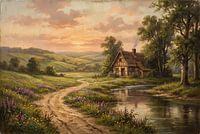 Laat je meenemen naar een moment van rust en eenvoud met Zonsondergang over het Stille Platteland. Dit kunstwerk toont een idyllisch landschap vol warme, natuurlijke kleuren: glooiende groene heuvels baden in het zachte licht van de ondergaande zon, terwijl een kronkelend pad tussen de wilde bloemen door leidt naar een klein houten…
