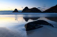 Zonsondergang over het strand van Nykvag op de Vesteralen archipel in Noord Noorwegen tijdens een mooie winterdag.