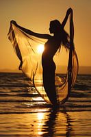 De afbeelding toont een silhouet van een figuur die een transparant doek in zijn handen houdt en in het water staat. De ondergaande zon straalt een warm, gouden licht uit dat door het doek heen schijnt en een betoverende sfeer creëert. De harmonieuze combinatie van licht, water en de sierlijke pose creëert een gevoel van vrijheid en gratie.