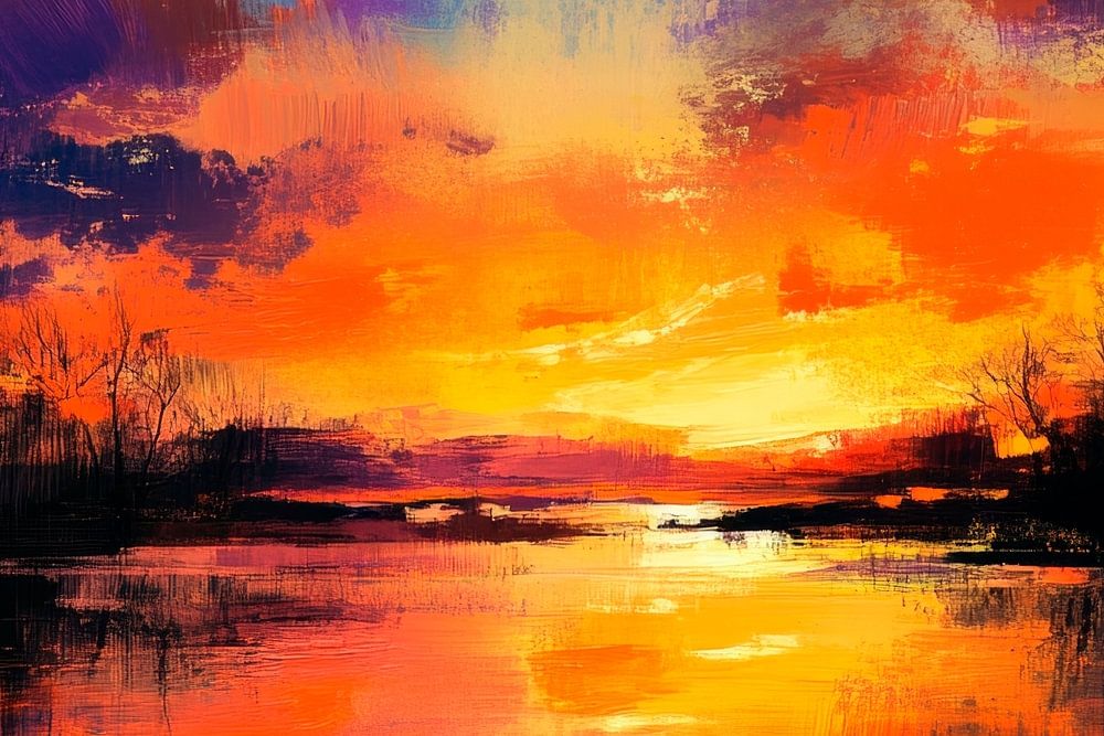 Een adembenemend kleurenspel ontvouwt zich aan de horizon, waar oranje en violette tinten zachtjes in elkaar overvloeien. Het kalme wateroppervlak reflecteert het avondlicht en creëert een dromerige sfeer. Dit kunstwerk zou perfect passen in een woonkamer, waar het zorgt voor ontspannende momenten en een uitnodigende sfeer.