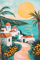 Een stralende zonsondergang baadt het mediterrane landschap in warm licht, terwijl sneeuwwitte gebouwen met rode daken charmante accenten zetten. De weelderige palmbomen en stralende sinaasappelbomen geven het pand een levendige frisheid. Dit kunstwerk brengt een vakantiegevoel in de woonkamer en nodigt je uit om te dromen.
