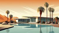 De print toont een minimalistische bungalow in de woestijn van Arizona, met strakke lijnen en eenvoudige geometrische vormen.
