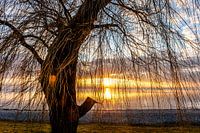 Zonsondergang aan het Bodenmeer in Duitsland met het silhouet van de beukenboom in de winter