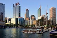 Kijken naar de skyline tijdens zonsondergang op de Elizabeth Quay Bridge in de stad Perth, West-Australië. Elke keer komen we terug naar dit uitzicht en we kunnen er geen genoeg van krijgen.