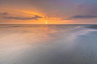 Minimalistisch beeld van een mooie zonsondergang aan het eind van een mooie zomerdag op het strand van Ameland. Gefotografeerd met een lange sluitertijd waardoor het water een zachte uitstraling krijgt.