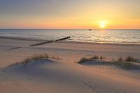 Warme kleuren van de zonsondergang boven 't strand van de Noordzee met aan de horizon een passerende vissersboot. Het zand van de duin op de voorgrond vertoont geen enkele storende voetstappen, slechts een door de wind gevormd ribbelpatroon.