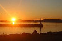 Hoewel je je aan de kust bevindt, en je recht naar de zon kan kijken, zal je de zonsondergang nooit zien. Want daar aan de horizon, voor de oceaan zich opent, is nog een lijn aan bergen te zien.