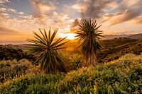 Een echt vakantiegevoel roept deze foto op. Op de voorgrond staan twee palmbomen met daartussen wilde bloemen en grassen. De zonnestralen schijnen precies tussen de palmbomen door. Terwijl de zon langzaam achter de bergen zakt kleurt de lucht licht oranje. De foto is genomen aan de kust van Andalusie, in Spanje.