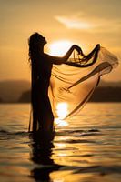 Op de foto staat een betoverend silhouet voor een gouden zonsondergang in het water. De flinterdunne stof omhult haar elegant, terwijl de zachte golven het licht weerkaatsen. De harmonieuze combinatie van lichaam en natuur creëert een dromerige sfeer die gratie en vrijheid uitstraalt.