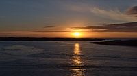 Adembenemende zonsondergang aan de kust van Snæfellsnes aan de fjord Breiðafjörður bij Stykkishólmur in het westen van IJsland met de silhouetten van kleine eilanden, een oranje gekleurde lucht en de ondergaande zon weerspiegeld in het water.