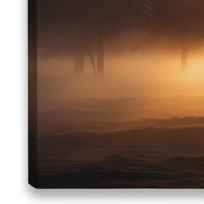 Ervaar de magie van een zonsopkomst in een loofbos met deze afbeelding. De mistige ochtend en de gouden stralen van de zon die door de bomen stralen, creëren een sfeer van rust en verwondering.