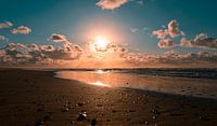 Prachtige zonsondergang met blauwe lucht en laag hangende wolken op het strand van Ameland. Prachtig gouden licht over het laagje water op de voorgond en over het strand. Leuk detail: In het zonlicht zit een heel klein stukje regenboog kleuren door de lensflare :)