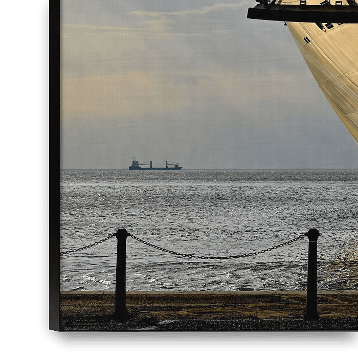 De boeg van een groot cruiseschip voor anker aan de waterkant. Het massieve, gladde oppervlak van het schip weerkaatst het licht van de laagstaande zon, die rechts achter het schip te zien is. Aan de linkerkant van de foto is in de verte een kleiner schip te zien dat rustig op het water drijft. De foto ademt een rustige sfeer uit door…