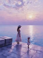 Dit impressionistische schilderij toont een ontroerend tafereel van een moeder en dochter die samen langs de rotskust wandelen en naar de zonsondergang kijken, terwijl de zee in zachte roze schittert in het licht van de namiddagzon. De lucht is licht bewolkt en straalt een serene sfeer uit, waarin de reflectie van het zonlicht op het water bijna dromerig aanvoelt.