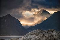 Zonsondergang over een Noorse fjord bij de Noordkaap.