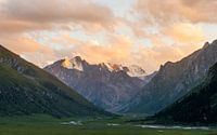 Zonsondergang in de Tian Shan bergen van Kirgizië. In de afgelegen vallei worden de met sneeuw bedekte toppen oranje aangelicht door de ondergaande zon