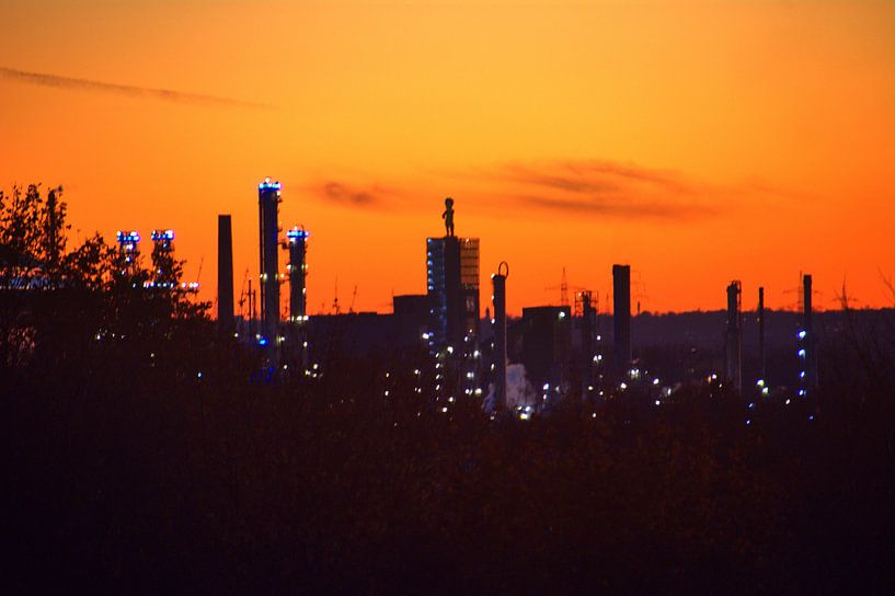 Gezicht op Gelsenkirchen-Horst met de Hercules van Gelsenkirchen en de lichten van de raffinaderij