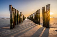 Een avond op het strand bij Vlissingen. Ze zon gaat onder, de zon komt van achter de palen en maakt een mooie zonnenster. Door de zon ontstaan er mooie schaduwen van de palen die in de avond steeds langer worden.