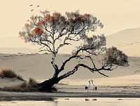 Een sfeervolle landschapsfoto waarin twee Japanse kraanvogels onder een boom met roodgekleurde bladeren poseren, met een imposante berg en een kalme waterpartij op de achtergrond tijdens zonsondergang.