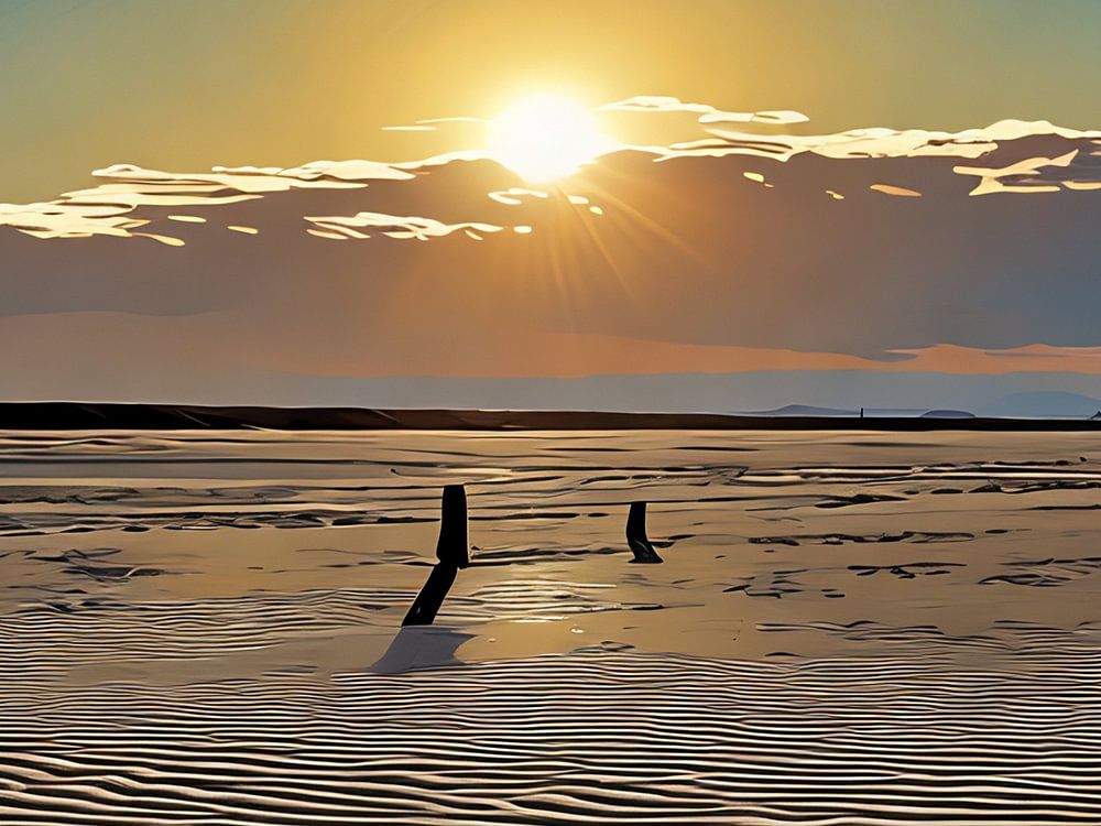 Zonsondergang strand in Riviera. De afbeelding toont een serene zonsondergang boven een zandstrand. De zon, een heldere bol van gouden licht, wordt gedeeltelijk verduisterd door een enkele wolk die een warme gloed over het tafereel werpt. De lucht gaat over van levendig blauw naar zacht oranje en roze, wat een prachtig verloop creëert. Op de voorgrond is het strand bedekt met ingewikkelde patronen van zandrimpelingen, gevormd door het terugtrekkende tij.