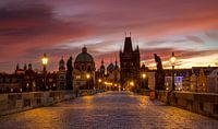 Landschapsfoto van de Karelsbrug in Praag, genomen in de vroege ochtend bij opkomende zon. De straatverlichting is nog aan en de wolken hebben een rode gloed. Het uitzicht is richting oude stad en op de brug lopen geen mensen.
