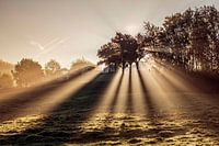 De eerste zonnestralen in het Vijlenerbos afgeschermd door een boom.