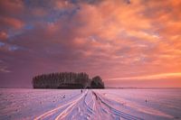 Landschap in Zeeland met sneeuw bij zonsopgang. De foto is gemaakt in de polder van Zeeuws-Vlaanderen, Nederland in de winter en toont een landweg naar een boerenschuur met er omheen besneeuwde weilanden.