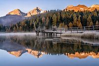 Ochtendmist en gouden lariksen op het Stazer meer in het Engadin bij St. Moritz. De alpengloed van de Zwitserse bergen en de zwemsteiger worden weerspiegeld in het spiegelgladde meer op een ijskoude herfstochtend.