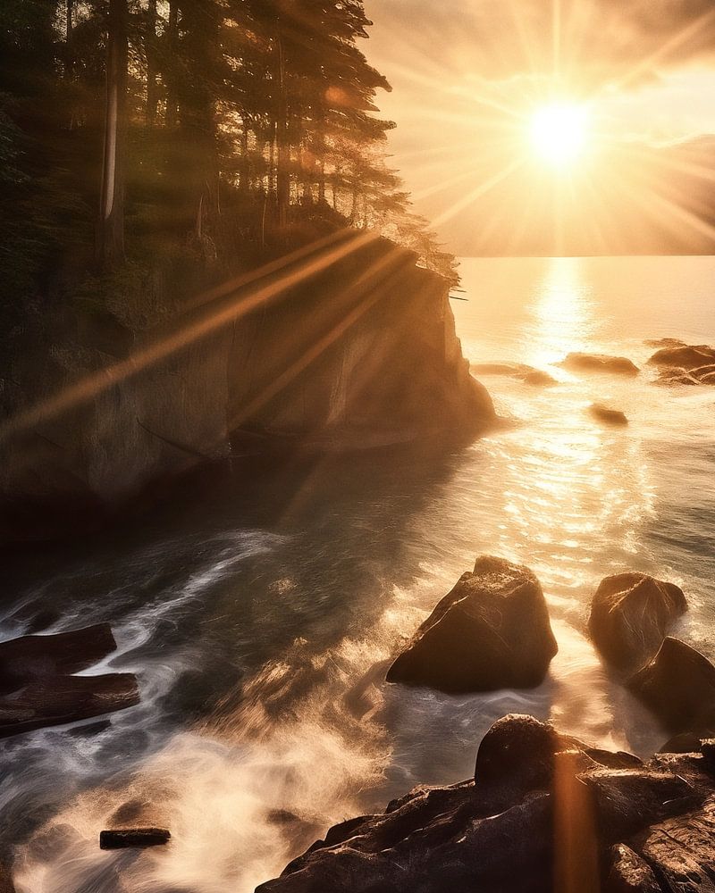 Zonsopgang aan de Stille Oceaan, romantische sfeer wanneer de zon achter de kliffen vandaan komt met een zonster aan de horizon