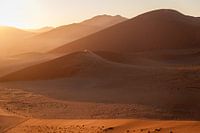 Linksboven in de foto, achter de duinen, komt de zon op. De zon zelf zien we niet maar vanaf links komen duidelijk haar stralen. De foto toont een heleboel duinen die in allerlei golvende lijnen achter elkaar liggen.