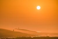 In de vroege ochtend ligt veel mist over de weilanden en het wad. Na verloop van tijd rijst de zon boven de nevel uit. een eenzame wandelaar loopt hem tegemoet.