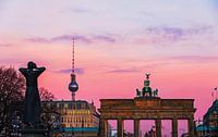 Zonsopgang achter de Berlijnse skyline aan de Brandenburger Tor en de televisietoren, bekende herkenningspunten van de Duitse hoofdstad