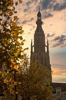 Op een mooie ochtend komt de zon tussen de bladeren op. In de verte zie je de mooie en slanke toren van de Grote Kerk van Breda. Het kleurenpallet in de lucht is prachtig rood, oranje en geel en geeft een magische sfeer weer, die zich over het centrum van Breda verspreidt. Dit moment, deze foto... Het pakt de magie van een vroege…