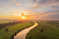 Zonsopgang boven de rivier de Vecht van bovenaf gezien tijdens een mooie herfstochtend in Overijssel, Nederland. De Overijsselse Vecht ontspringt in Oberdarfeld in de Duitse deelstaat Noordrijn-Westfalen en stroomt noordwaarts naar Nedersaksen, over de grens met de Nederlandse provincie Overijssel. Daar stroomt de rivier door de regio Salland en vlakbij Zwolle mondt de rivier uit in het Zwarte Water.