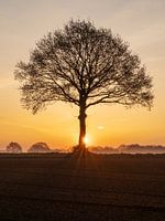 Zonsopgang bij een kale boom in het akkerland in Midden-Limburg.